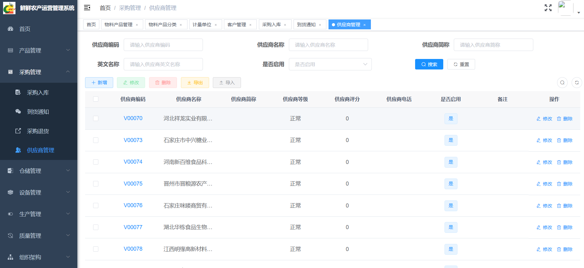 在运营管理系统中,供应商管理需通过菜单栏【采购管理】=>【供应商管理】进入功能页面操作,核心是维护供应商基础信息。必填内容为“供应商编号”和“供应商名称”,用户还可根据工厂需求补充供应商简称、英文名称、简介、地址、官网、邮箱、电话、联系人(含联系方式)、统一社会信用代码、供应商等级、评分、LOGO地址等信息;支持对供应商信息进行新增、修改、删除、导入、导出及按供应商编码、名称等条件搜索。其中,供应商编号自动生成功能需提前在【系统管理】=>【编码规则】中配置规则编号为VENDOR_CODE的编码规则,系统页面会展示供应商编码、名称、简称、等级、评分、电话、是否启用、备注及操作选项等信息,方便企业管理合作供应商。